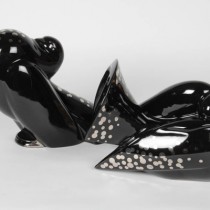 Hand painted and glazed porcelain with aqua, black and silver tones.