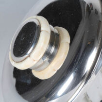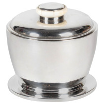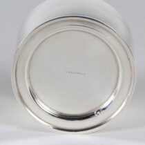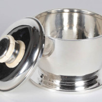 Jean E. Puiforcat is the most famous name of Art Deco silverwork. This is a gently tapered round footed and covered box of beautiful form and proportion with a contoured gear-like bone and silver finial. Overall it is a signature example of French Art Deco silver and dates from the late 1920’s and bears the early mark of Jean E. Puiforcat spelled out in addition to all of the appropriate French silver standard touchmarks. It is a really perfect example of French Art Deco silver by the French master of them all, Puiforcat!