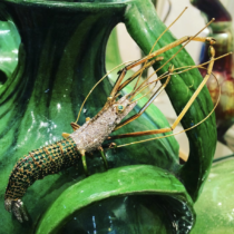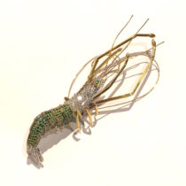 Jeweled and highly detailed “Shrimp” brooch, tsavorite garnets and diamonds pave set throughout the 14 white and yellow gold body, marked, c. 1980