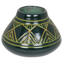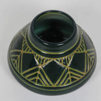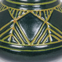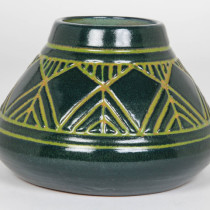 Julia Edna Mattson worked as an instructor and later as Assistant Professor in the University of North Dakota’s Ceramic department between the years 1924-1963. Her designs reflect an interest in the Arts and Crafts movement in America and American Indian pottery. Early UND pottery is characteristic of the Arts and Crafts and Art Nouveau movement. The decoration of this vessel recalls the graphic designs found on Indian basketry as well as the Prairie School windows of Frank Lloyd Wright.