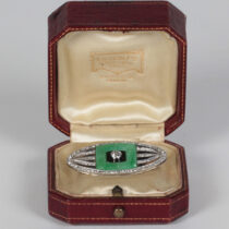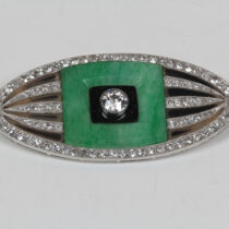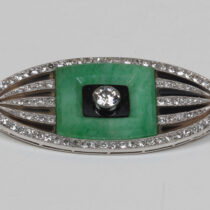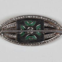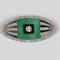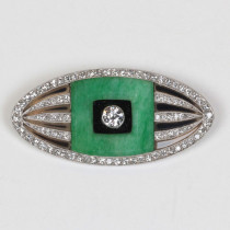 Lacloche Art Deco “Melon” brooch, jade, onyx and diamonds set in platinum, signed, original leather box c. 1930