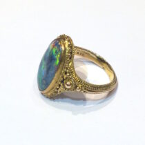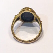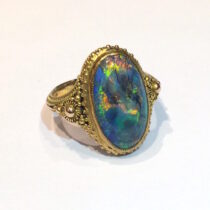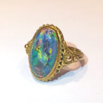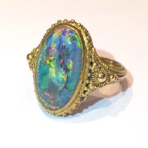 Marcus & Co. Arts & Crafts “Byzantine Revival” black opal (approx. 4 carats TW) ring in an elaborate wirework and applied beadwork 14k gold mounting, signed, c.1910