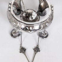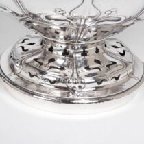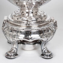 Completely specially handwrought sterling silver in an overall organic form with highly stylized vines and blossom motifs with cutout details on the base. Bone spacers and finial for burner handle. Approx. silver weight is 66 troy ounces.