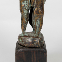 Patinated bronze with a verdigris patina in the recessed areas and natural bronze highlights, original wooden plinth / base.