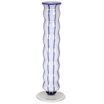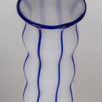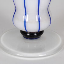 “Opal mit streifen” opaline blown glass with applied blue glass canes and blue knob above opaline base