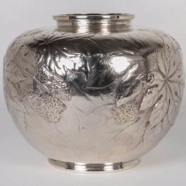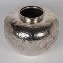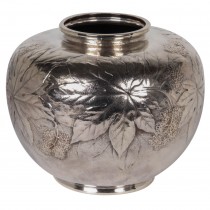Silver with repoussé blossoms and leaves on a bulbous form with collar