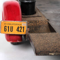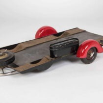 Steel and various metals with the car and trailer details painted red, rubber tires and cork details
