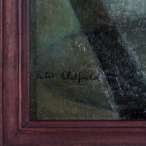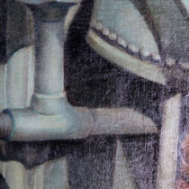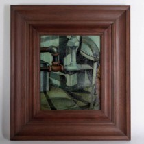 ***The Metropolitan Museum of Art in New York owns a famous Gelatin silver print photograph by Morton Schamberg from 1916 entitled “God”. This image is akin to Duchamp’s “Fountain” and is an iconic Dadaist assemblage of plumbing pipes mounted on a miter box. The “Water Pipes and Shadows” painting by Otis Oldfield similarly brings a certain animation and personality to an under sink composition of mundane drain pipes in a sophisticated “Rayonist” or “Cubist” stylization. Otis Oldfield was born in Sacramento, California in 1890. He enrolled in the Best Art School in San Francisco in 1909 and continued his studies at the Academie Julian in Paris. Returning to the U.S., Oldfield settled briefly Sacramento before returning to San Francisco to accept a post as a teacher at the California School of Fine Art. Oldfield developed a bold modernist style, which caused some controversy among critics covering his exhibits. In 1936 Oldfield was one of a group of San Francisco artists chosen for a WPA project to paint murals in San Francisco’s Coit Tower. Following WW II, Oldfield taught at the California College of Arts and Crafts in Oakland. He died in San Francisco in 1969.