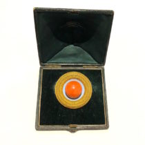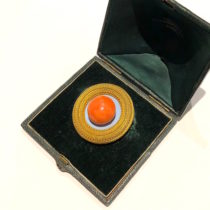 Robert Phillips, London (1810-1881) Archaeological Revival round “Button” brooch in 18k gold set with a large cabochon salmon coral jewel, original leather presentation box, signed, c.1875