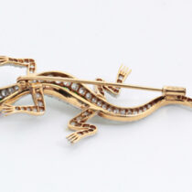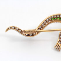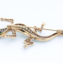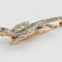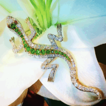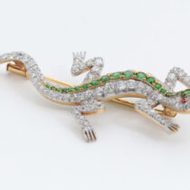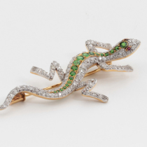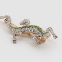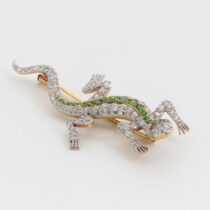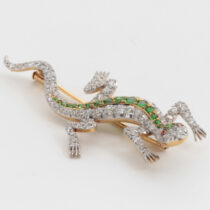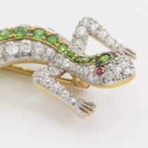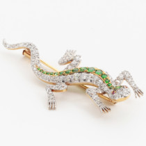 Shreve & Co. San Francisco, Lizard brooch with demantoid garnets and diamonds set in a platinum topped 18 K gold mount with 2 ruby eyes, signed, c. 1900