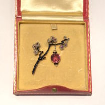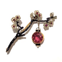 Sigmund Zuckermandl, Vienna, “Cherry Blossom” brooch, enameled 18K gold set with diamonds and pink tourmalines further set with a large round pink tourmaline as a hanging lantern and a pearl, signed, c. 1890