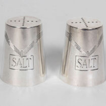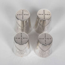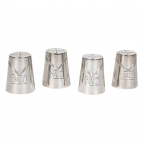 Sterling set of four salt shakers with ribbon and hanging pendant motif c. 1938