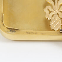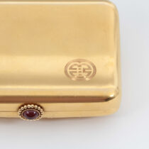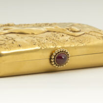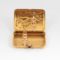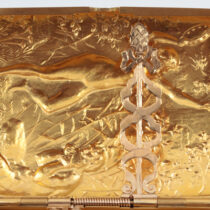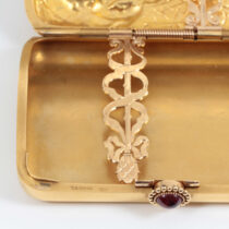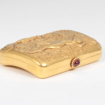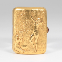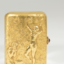 Theodore B. Starr New York, “Pan and the Muse” 18K gold box with exceptionally fine hand repousse work, set with a cabochon ruby, signed, c. 1890