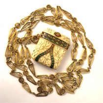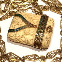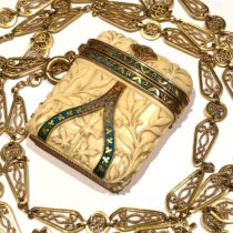 Tiffany & Co./Georges Le Sache, Neo Gothic “Vesta” case, 18k gold mountings, polychrome champleve enamel details on a “bone” covered case, hand carved foliate details, 18k gold long chain, signed, c. 1880