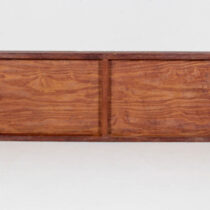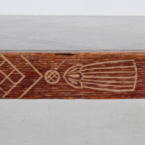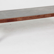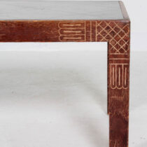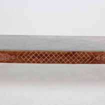 completely handmade and dates from 1940, shortly after Parzinger opened his first eponymous gallery on East 57th Street. It is low and lean with exquisite Neoclassical Revival carved details and a silhouette that calls to mind an American take on Jean Michel Frank’s sober and refined elegance of the same time period. The cross-hatch carving with tassels on the two long sides and the related top corner details also have a charm reminiscent of Parzinger’s affable personality and effervescent design sensibility.