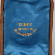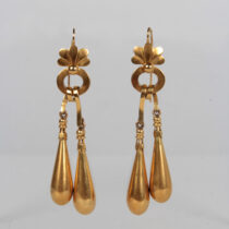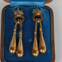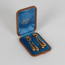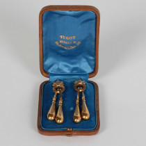 Tugot, Paris “Archaeological Revival” 18K gold pendant earrings, original leather box, c. 1880