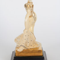 Hand-modeled and molded cream glazed earthenware figure with gold and silver details on a separate, but matching black glazed earthenware base.