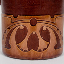 Brown glazed red clay with tan light brown cut out overlaid and sgraffito decoration in a stylized organic motif, two applied looping handles